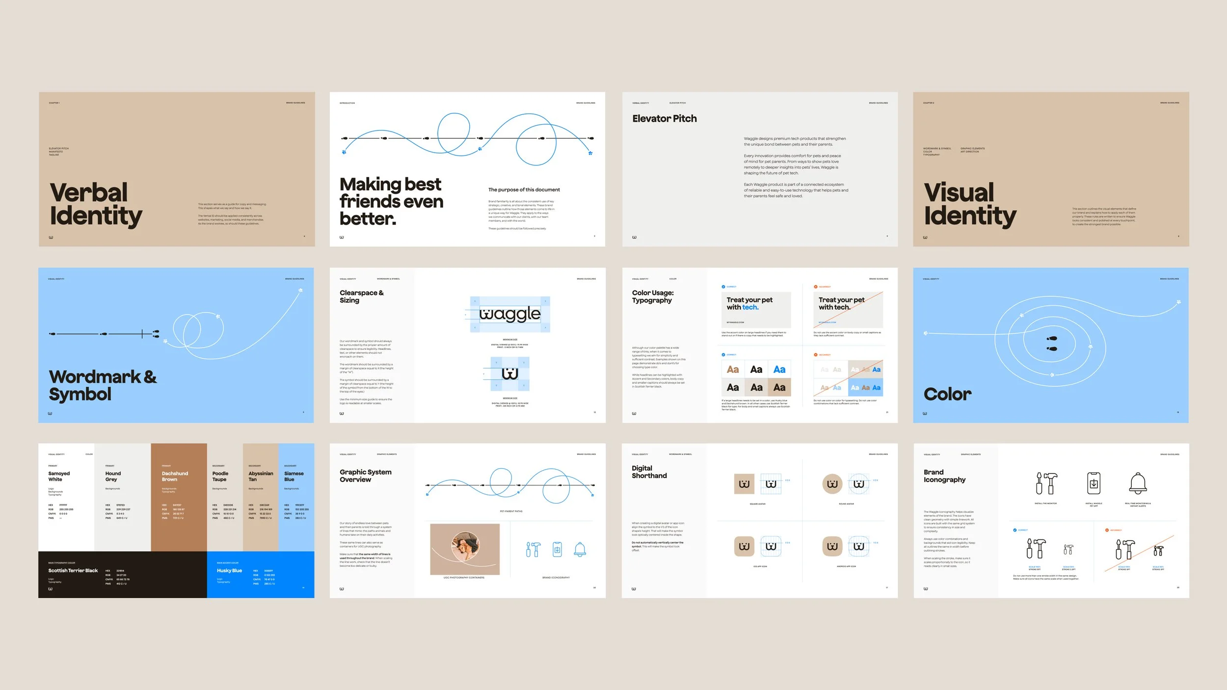 For Waggle’s new visual and verbal identity, we used those special relationships as the foundation of our work. Line work inspired by pet movements formed a playful, friendly symbol that gets every tail wagging.